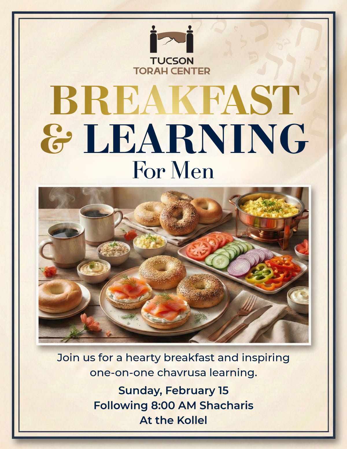 Sunday morning bagels & learning, for men of all ages and backgrounds.